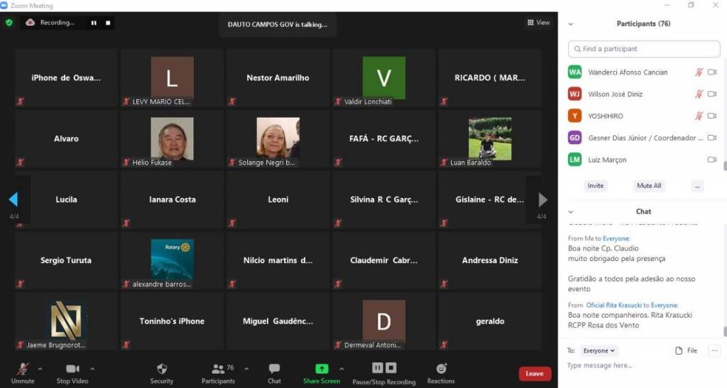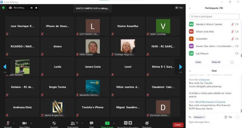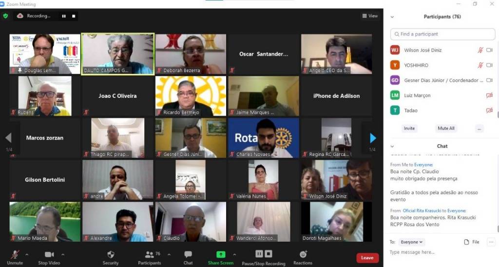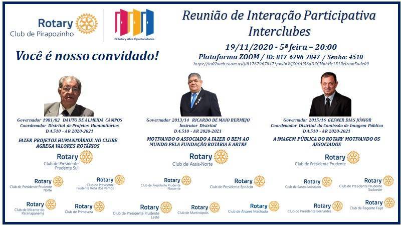 Reunião de Interação Participativa Interclubs aconteceu dia 19-11-2020 on line, com 82 pessoas, onde participaram os Rotary Clubs do Distrito 4510 : RCPP Rosa dos Ventos, RCPP Leste, RCPP Norte, RCPPrudente, RCPP Nascente, RCPP Sul, RCPP Sudoeste,RC de Pirapozinho, RC de Assis -Norte, RCP Epitácio, RCSanto Anastácio, RC de Mirante do Paranapanema, RC de Primavera, RC de Martinópolis, RC de Alvares Machado, RCP Bernardes, RC Regente Feijó, RC de Garça. Com três excelentes pal…
