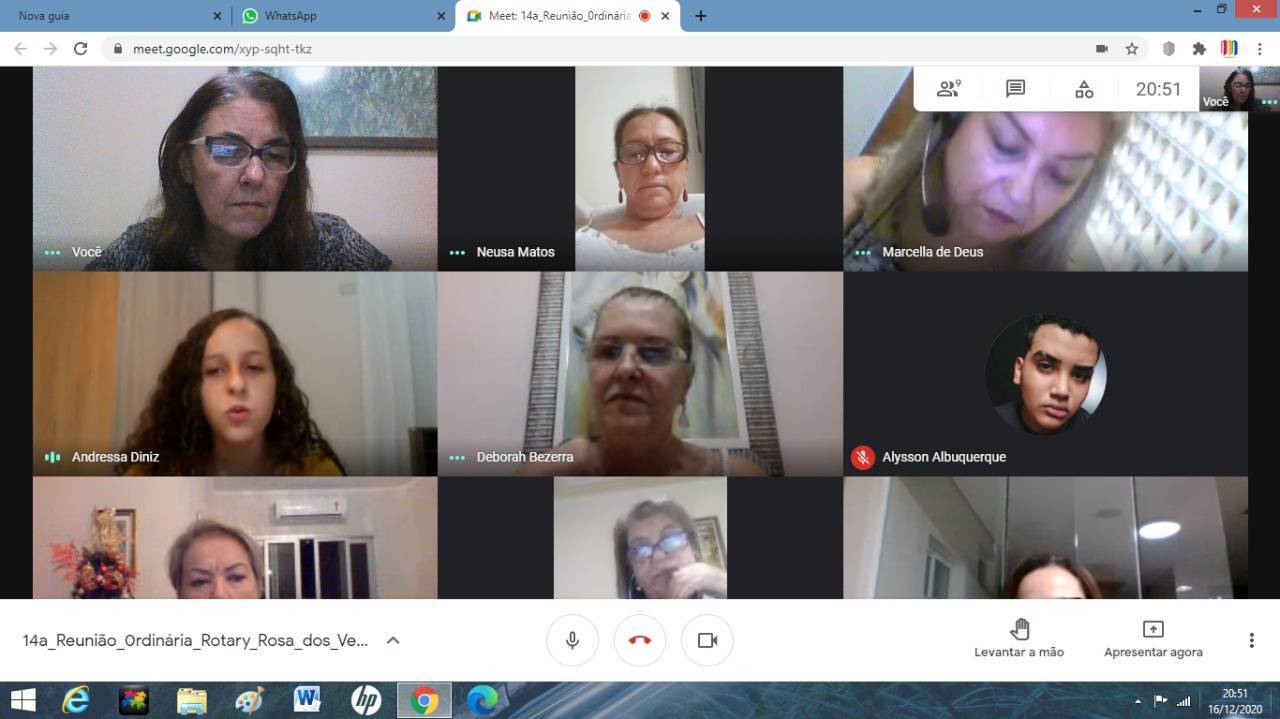Reunião on- line dia 16-12-20, tivemos as visitas: Associada Honorária e comp. do RC de Primavera,Nelly Caldas Costa Sá, Presidente Interact PP Leste, Andressa Diniz, Vice- Presidente Rotaract PP Leste, Monica Alencar Silva, Presidente eleito 2021/22 do Interact PP Leste Alysson Albuquerque.
