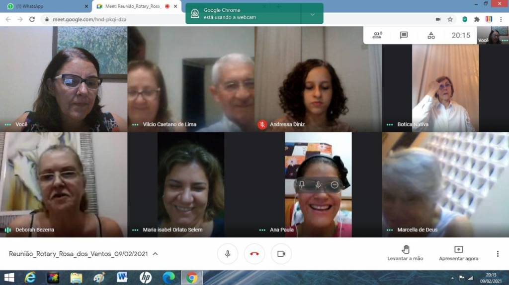 Reunião on line dia 09-02-21, tivemos as visitas : Gov. 2014/15 Vilcio Caetano de Lima, presidente do Interact CPP Leste- Andressa Diniz, nossa convidada, ex companheira Maria Isabel O. Selem.