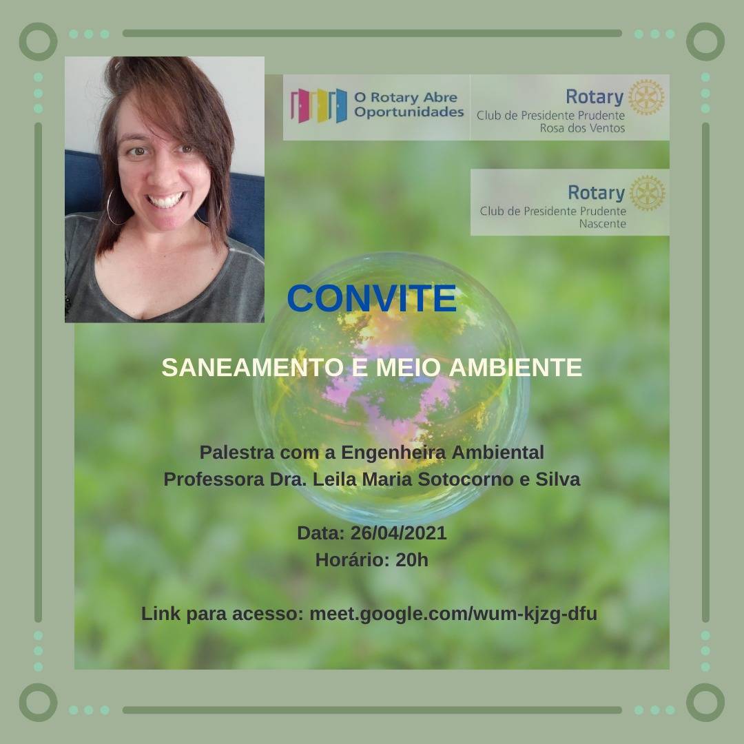 folder da palestra a ser dada dia 26/04/21 da Engenheira Ambiental Leila Maria Sotocorno e Silva e reunião conjunta com RCPP Nascente, RC de Piratininga.
