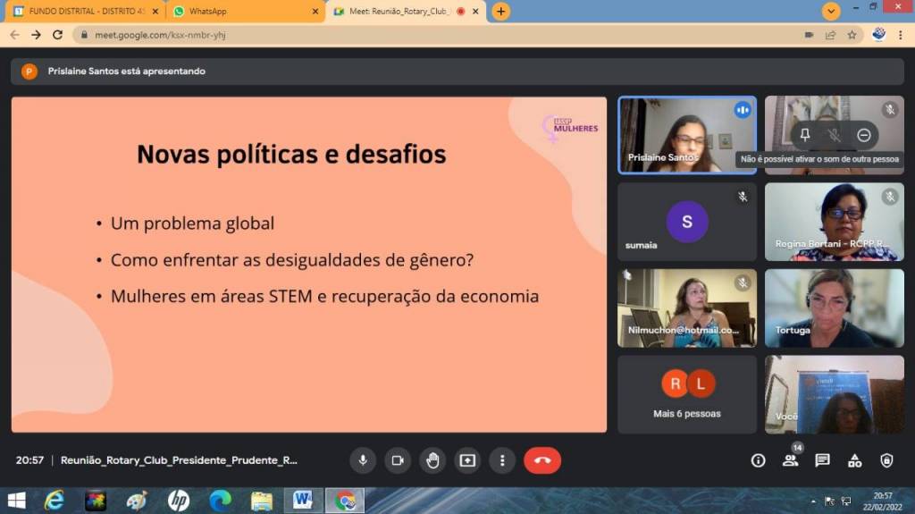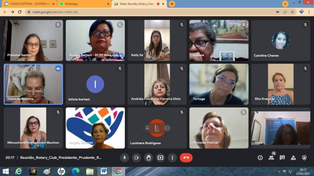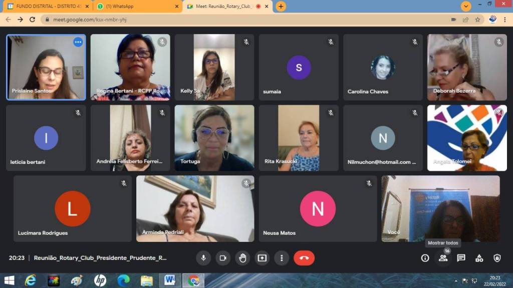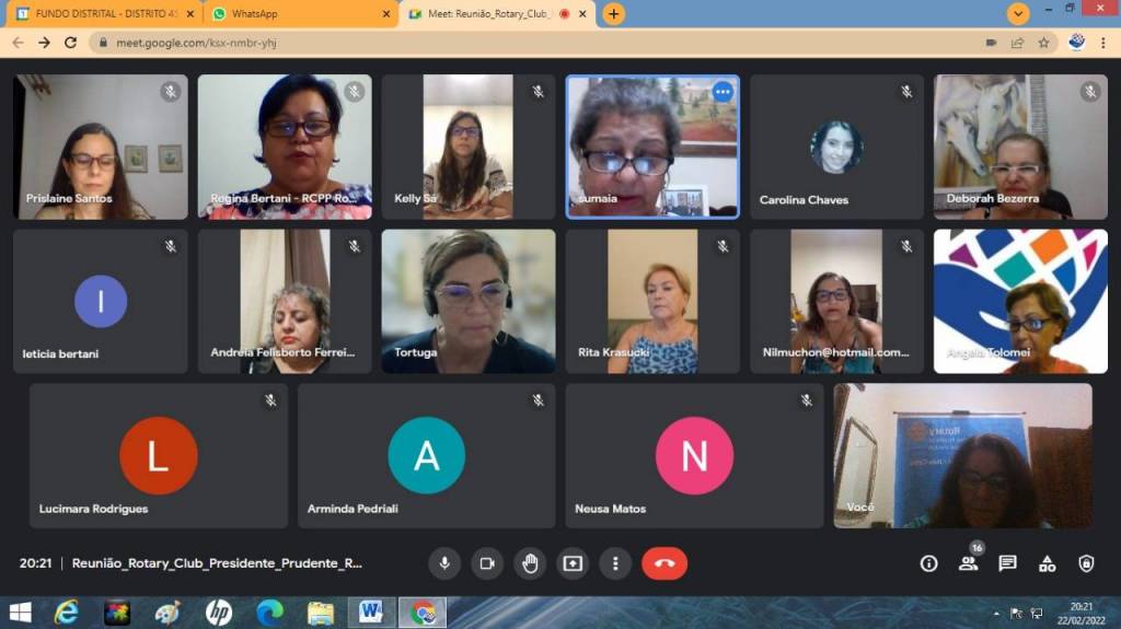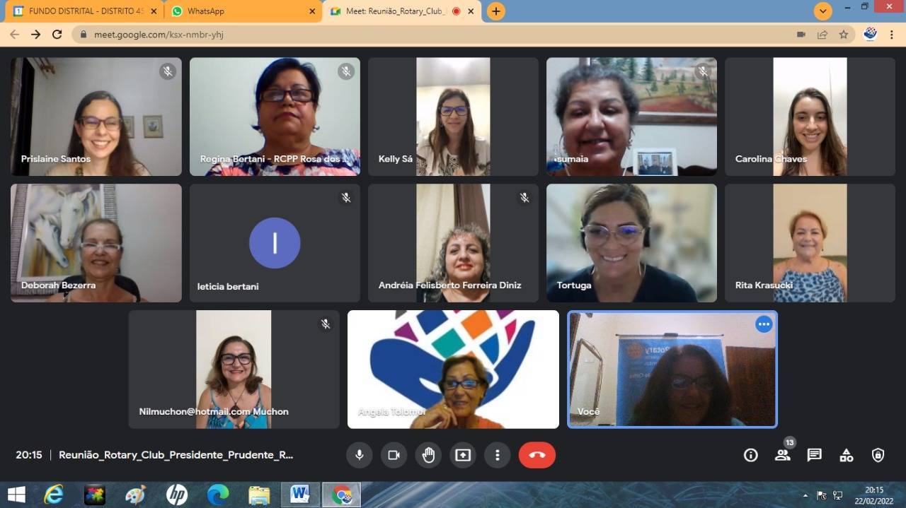 Vigésima terceira reunião da gestão 2021/22, dia 21-02-22 com palestra da Psicóloga Prislaine Krodi dos Santos sobre empoderamento das mulheres, tivemos as presenças: GA, Angela Tolomei, Presidente do Fundo Social de Pres. prudente Lucimara Rodrigues, comp. do RCPP Nascente, Andréia Felisberto F. Diniz, comp. do RCde Presidente Venceslau, Nilcéia Muchon, Arminda Pedriali, Elizabete Pereira Costa convida da presidente Eliane, Carolina Chaves, Leticia Bertani.