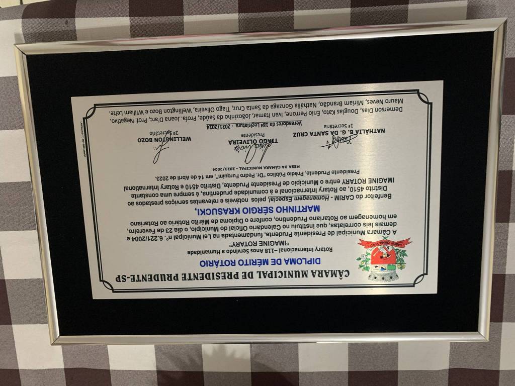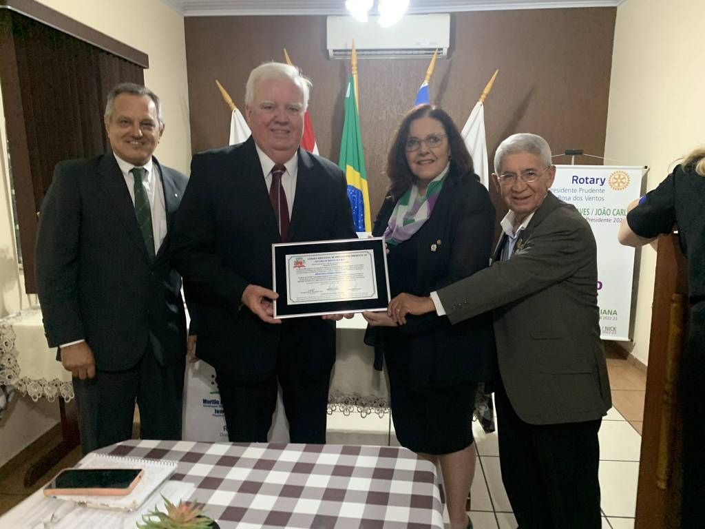 Reunião do dia 23/05/23, foi uma homenagem especial da Câmara de Presidente Prudente ao Martinho Sérgio Krasucki pelos notáveis e relevantes serviços prestados ao Distrito 4510, ao Rotary Internacional e a sociedade prudentina. Tivemos asa presenças: Gov. 2014/15, Vilcio Caetano de Lima,Governador Assistente do RCPP Alvorada,Geraldo Paim, Presidente RCPP Alexandre Barros, comp. RCPP, Yussufumi Sunaga, comp. RCPP Sudoeste, Hulisses Gonçalves, homenageado Martinho Sérgio Krasucki e sua família e nossa ex. companheira Rita Krasucki .
