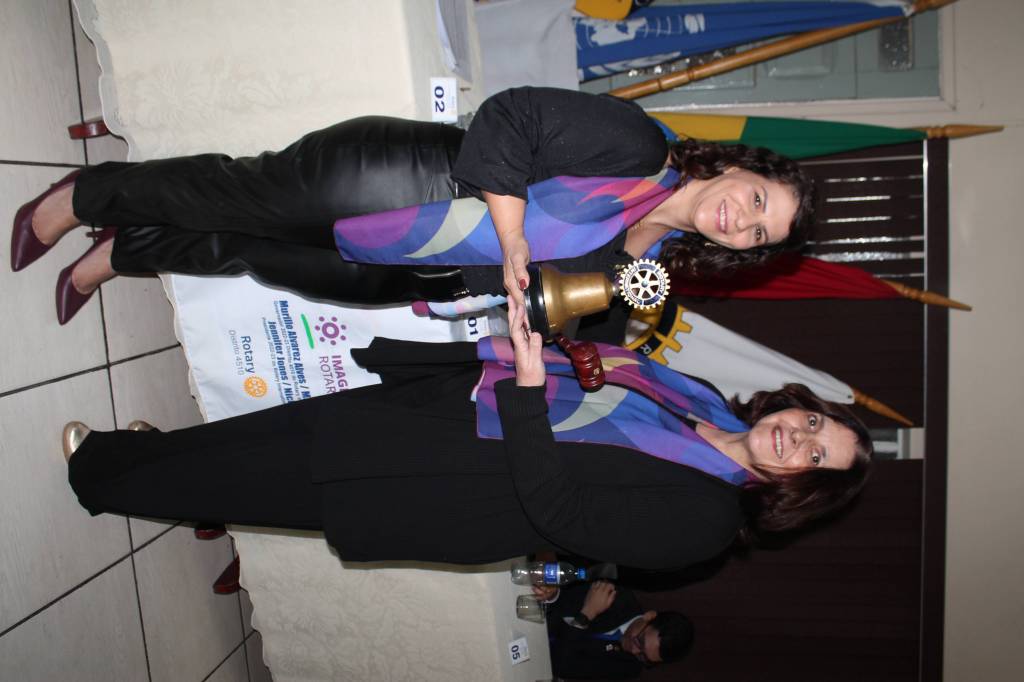 Presidente 2022/23 Eliana Ederle Dias Chaves passando o sino e o martelo para presidente 2023/24 Kelly Regina Sá Soares para dar o primeiro toque no sino
