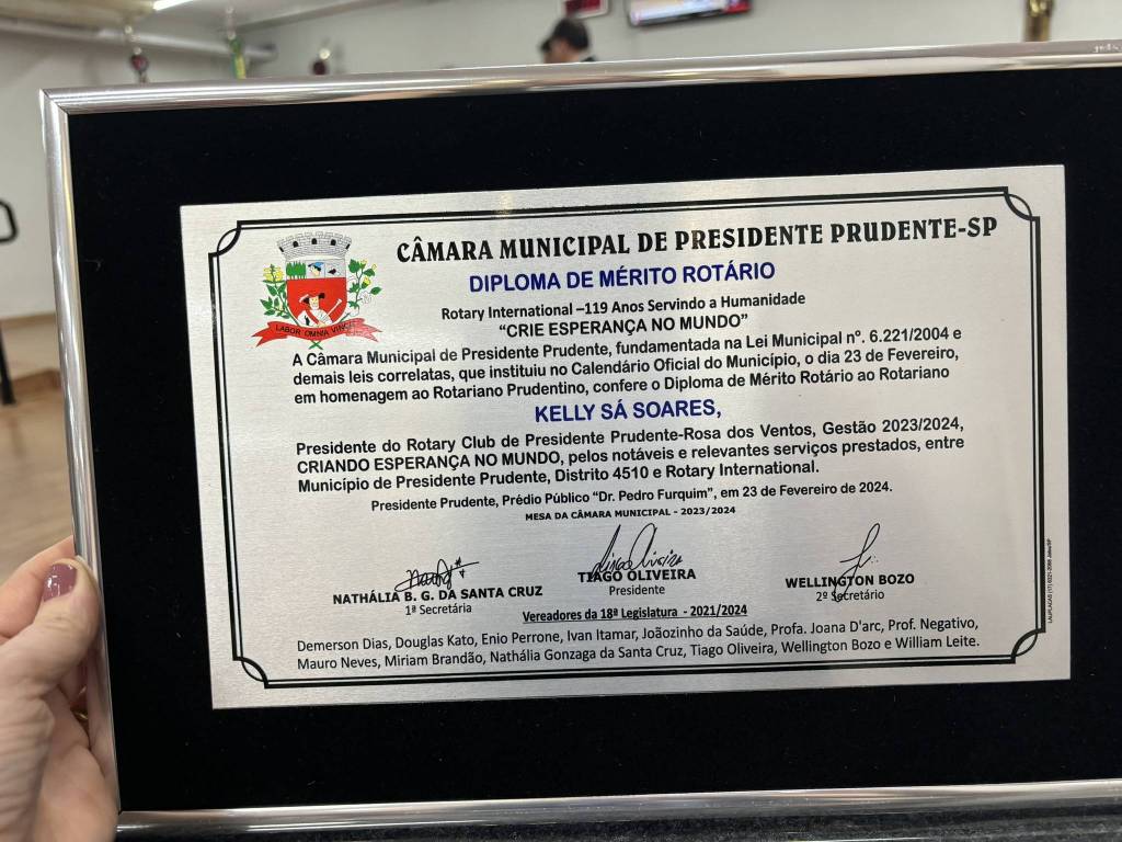 Homenagem da Camara Municipal de Presidente Prudente ao dia do rotariano a todos os clubes rotários de Prudente,dia 23/02/24.