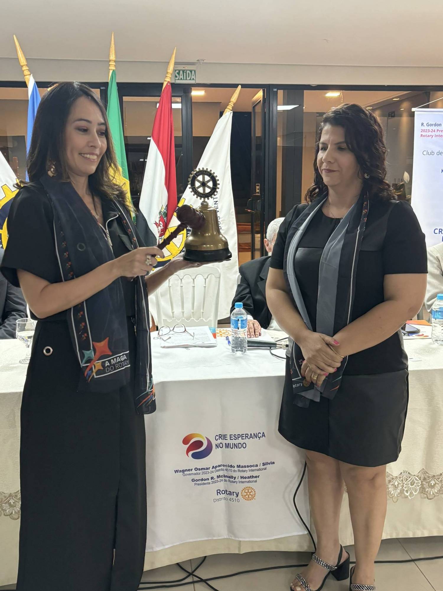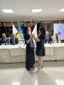 Presidente 2023/24 Kelly Regina Sá Soares passando sino e o martelo para a presidente 2024/25 Vanessa Komatsu, dia 02/07/24 na OAB