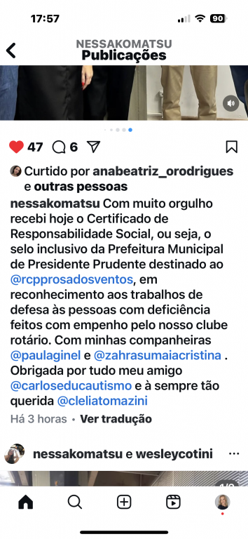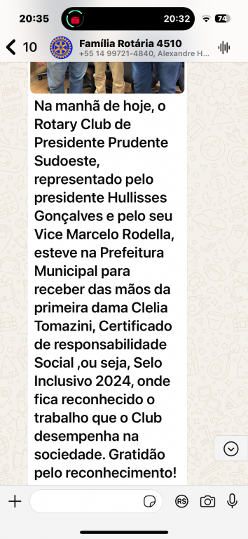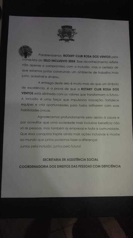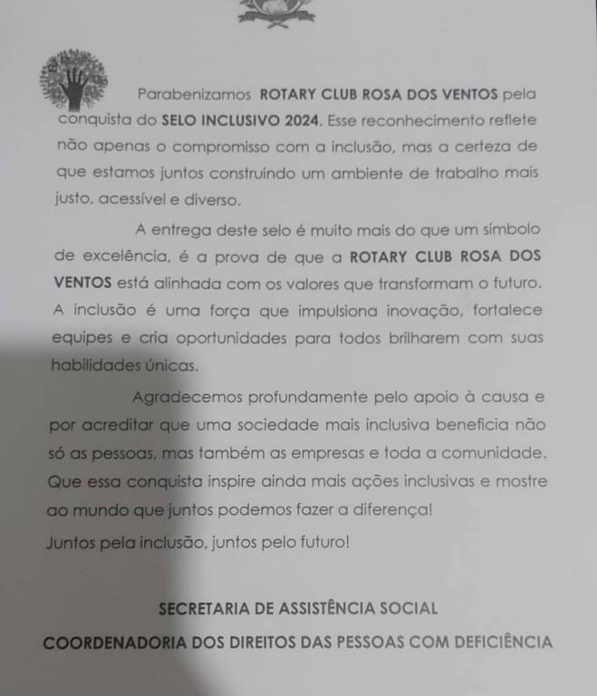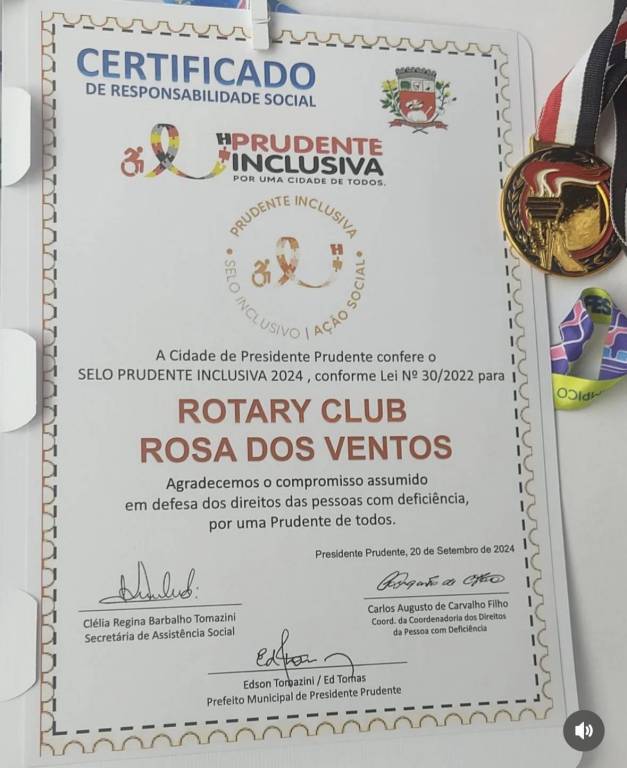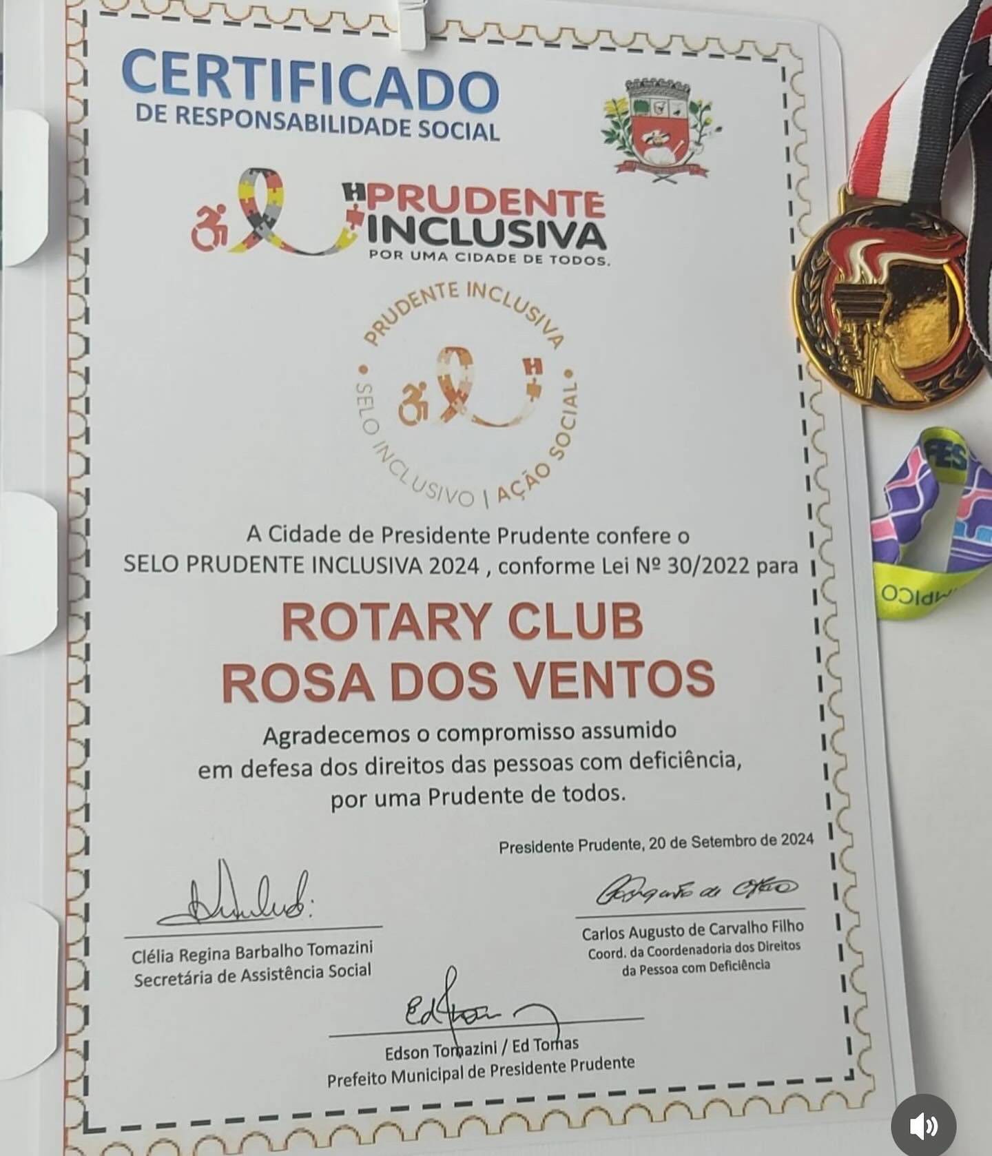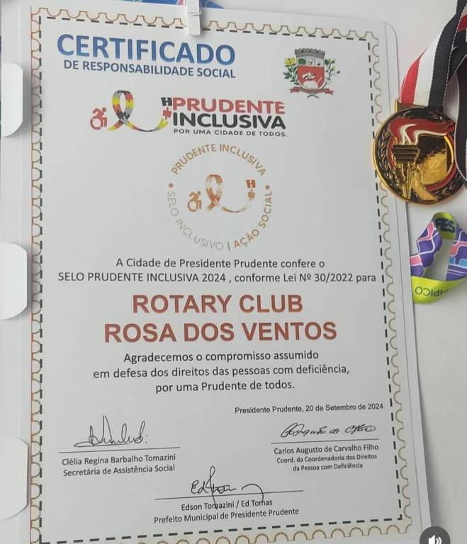 O RCPP Rosa dos Ventos recebeu o Certificado de Responsabilidade Social , selo inclusivo pelo reconhecimento pelos trabalhos de defesa as pessoas com deficiências na manhã do dia 20/09/24 na Prefeitura de Presidente Prudente . A presidente Vanessa Komatsu recebeu o certificado das mãos da primeira dama Clelia Tomazini e em companhia com nossas companheiras, Sumaia e Paula.
