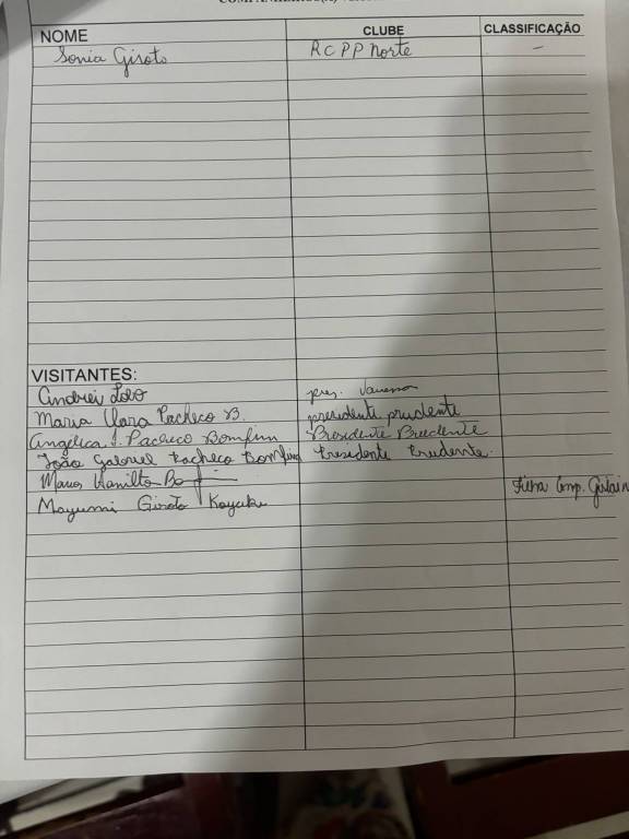 Reunião dia 21/01/24, tivemos as visitas: GA do RCPP Norte Carlos Giroto sua esposa RCPP Norte Sonia Giroto , comp. RCPP Iussufumi Sunaga , comp. RC de Dracena Imperial Paulo Sergio, Andrei Lobo e convidada da presidente Vanessa, Angelica Pacheco Bonfim, seu marido Marcos Bonfim,seus filhos Maria Clara e João Gabriel e Mayumi Giroto Koyuke , filha da comp. Gislaine.