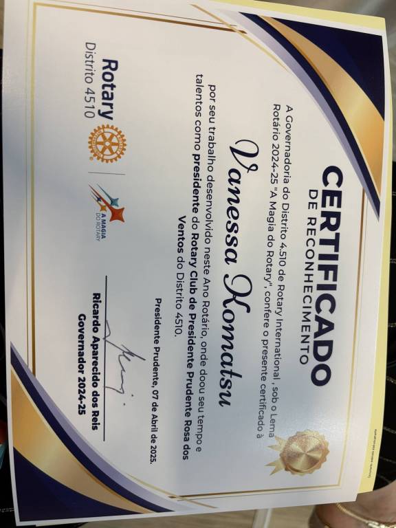 Homenagem da Camara Municipal de Presidente Prudente aos rotarianos com entrega de certificado ao Governador do Distrito 4510 Ricardo Aparecido Reis , presidente dos clubes rotários e Governadores Assistente dia 07/04/25.