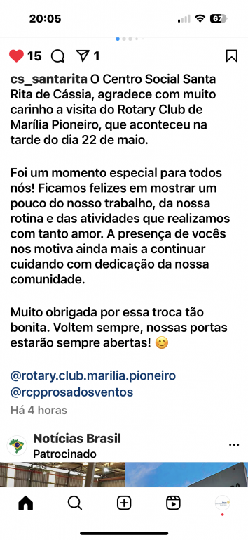 Na tarde desta quinta-feira, 22 de maio de 2025, o Rotary Club de Marília Pioneiro realizou uma visita especial ao NRDC Santa Rita de Cássia. A atividade teve como objetivo conhecer de perto o trabalho desenvolvido pela instituição.