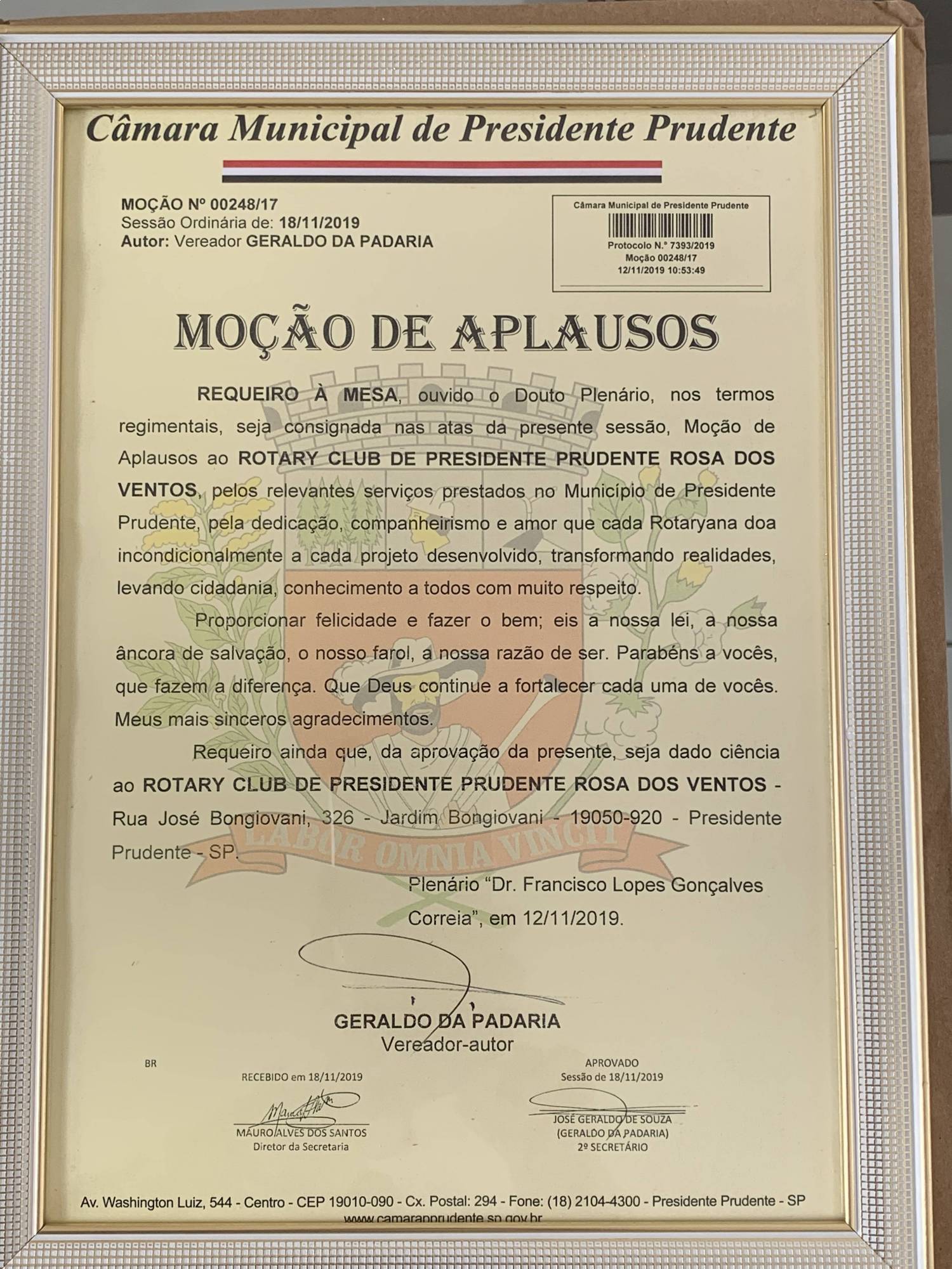 Recebemos da Câmara Municipal de Prudente a Moção de Aplausos dia 10/12/19