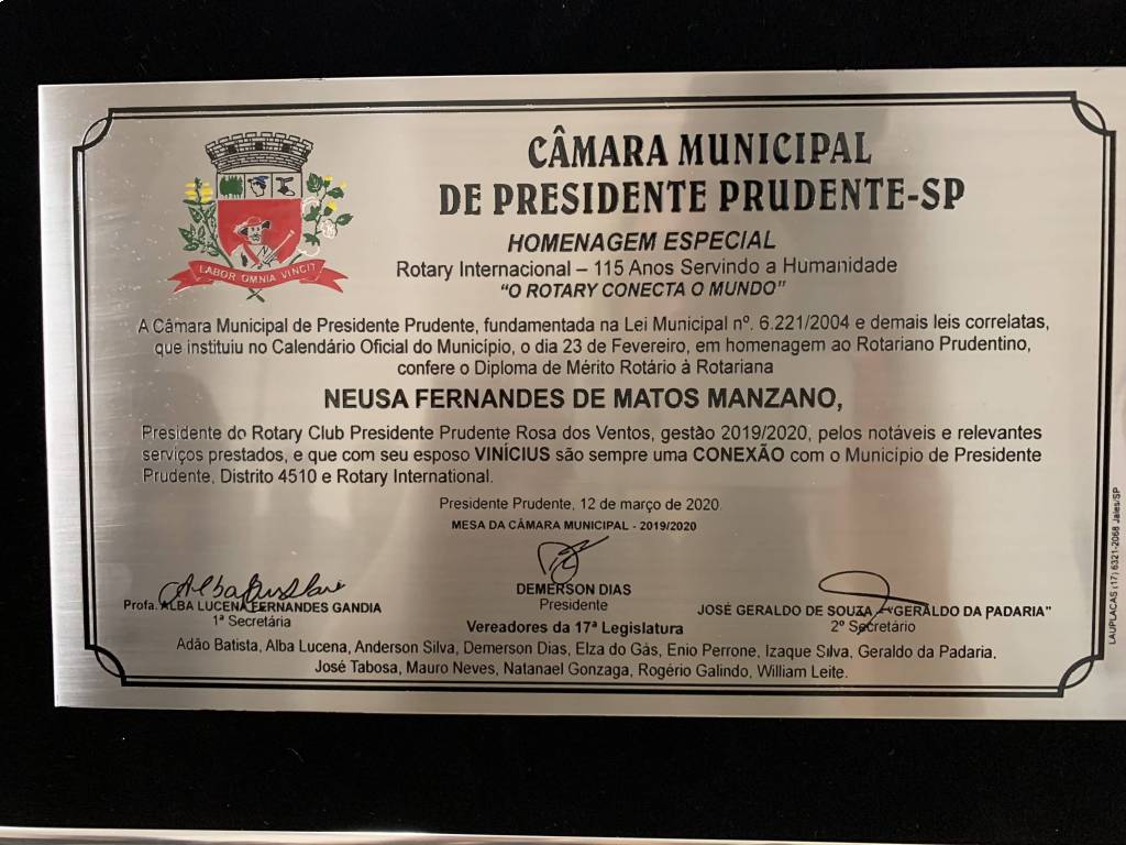 Homenagem da Camara Municipal de Presidente Prudente ao dia do rotariano dia 12/03/2020
